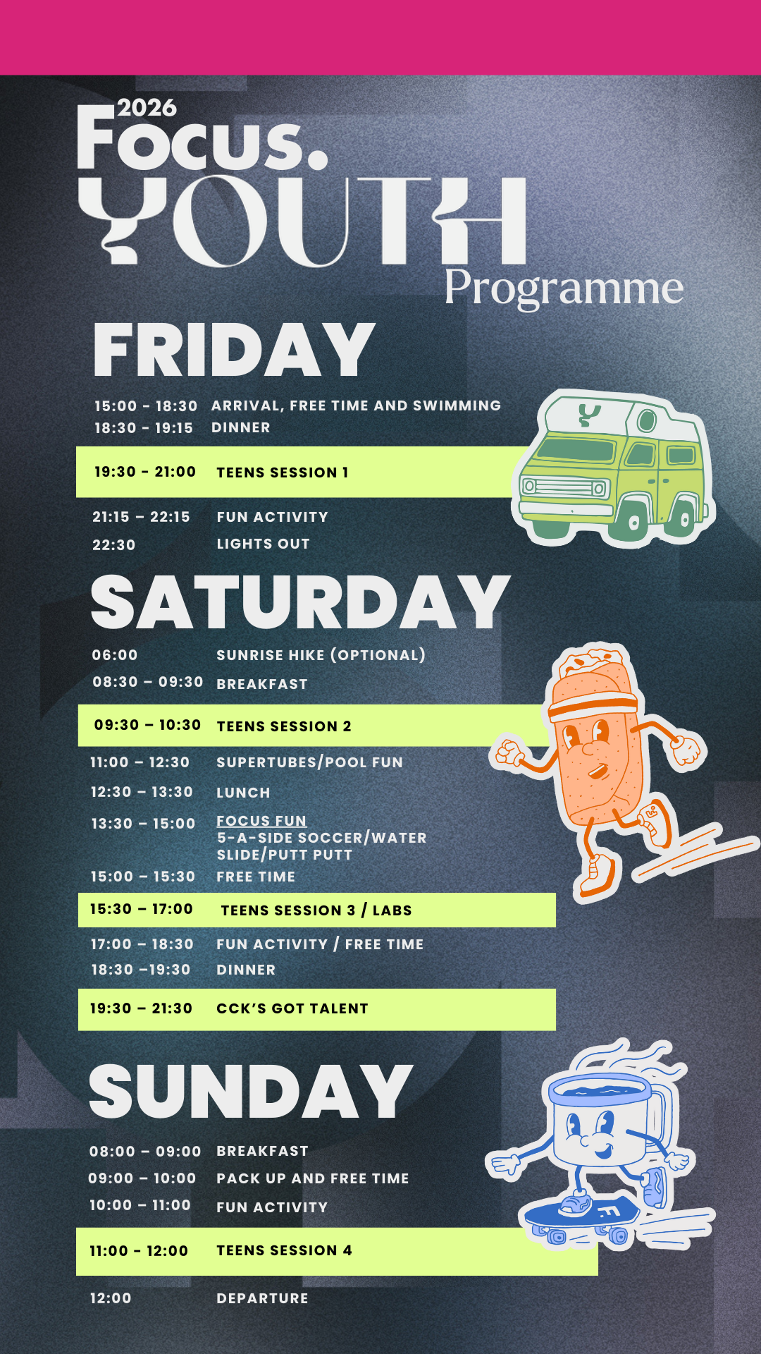 FOCUS YOUTH takes place alongside the larger adult FOCUS, but will have its own dedicated youth programme, with some overlap for worship sessions and CCK’s Got Talent.